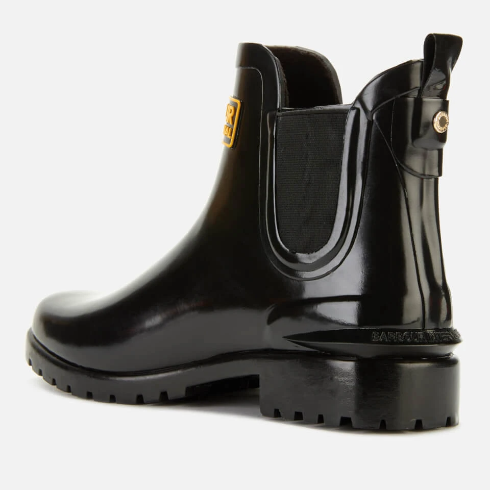 Barbour International glossy black wellingtons with a Chelsea boot-inspired design. The ‘Assen’ slip-on ankle boots are designed with elasticated side gores, a signature Barbour International badge at the front and a durable rubber outsole with a small heel. A heel pull loop with a logo stud and a branded heel counter completes the design.