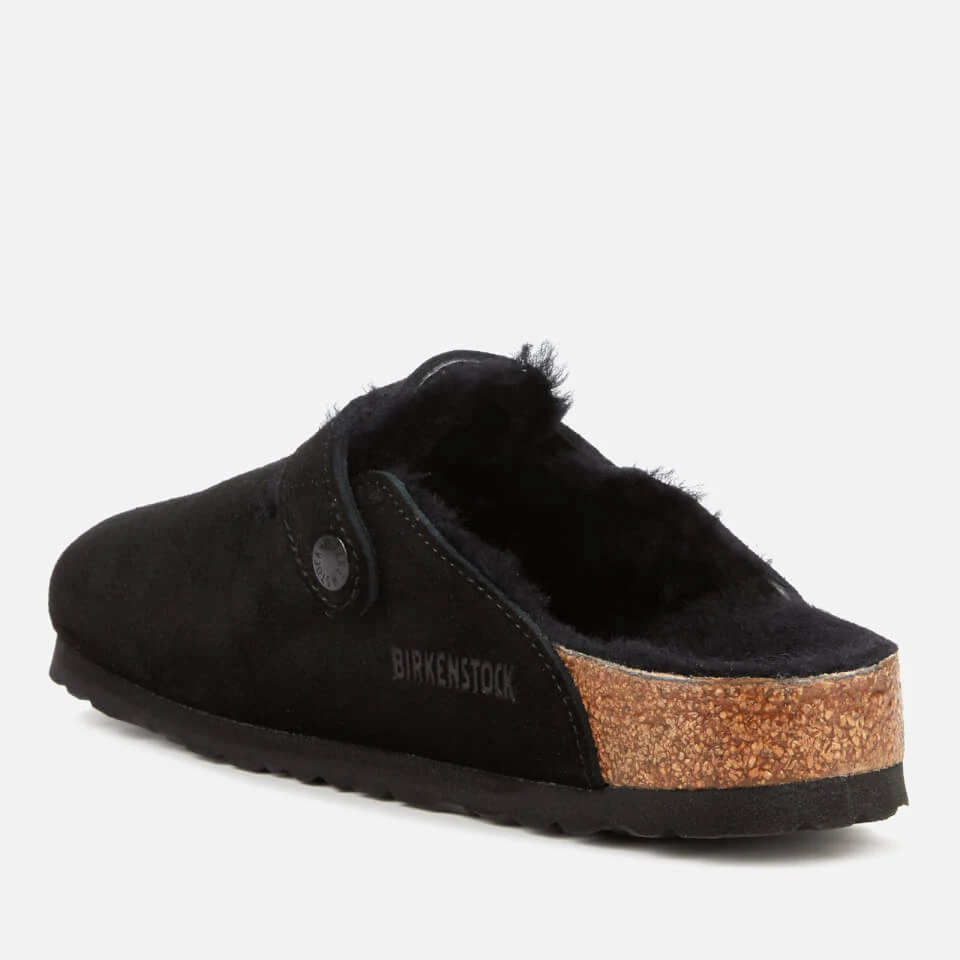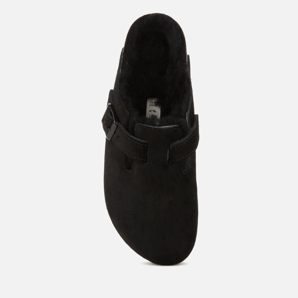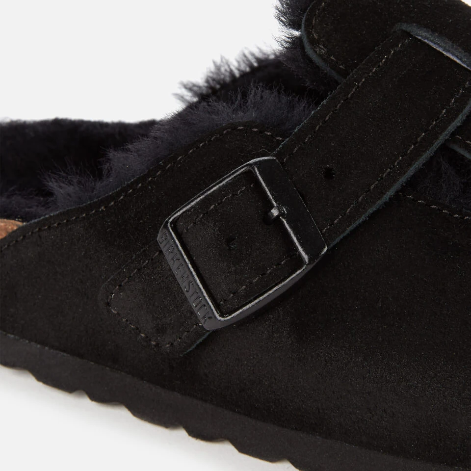 Birkenstock ‘Boston’ mules in soft black suede with tonal shearling lining made from natural lambskin. The closed-toe clogs feature a slip-on construction with a decorative buckle on the outer quarter. Built upon an anatomically formed cork and latex footbed, the black mules are complete with a serrated outsole for grip.