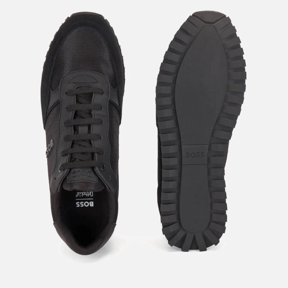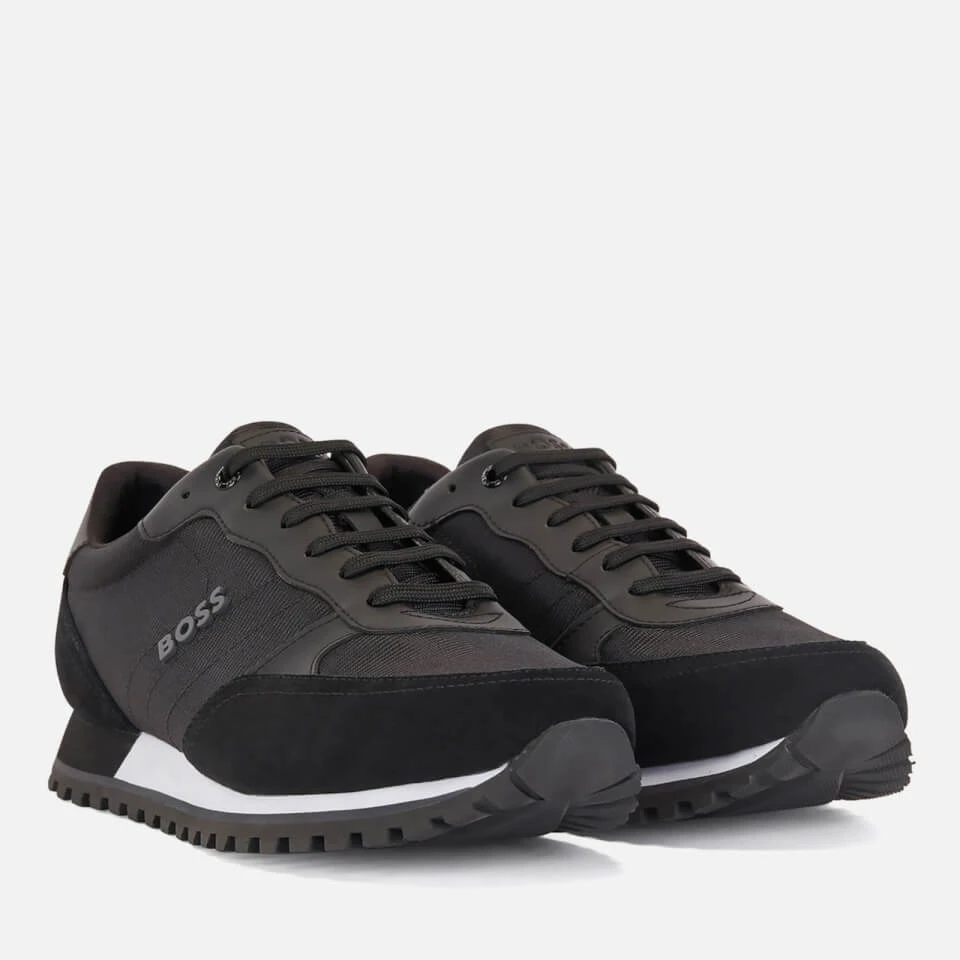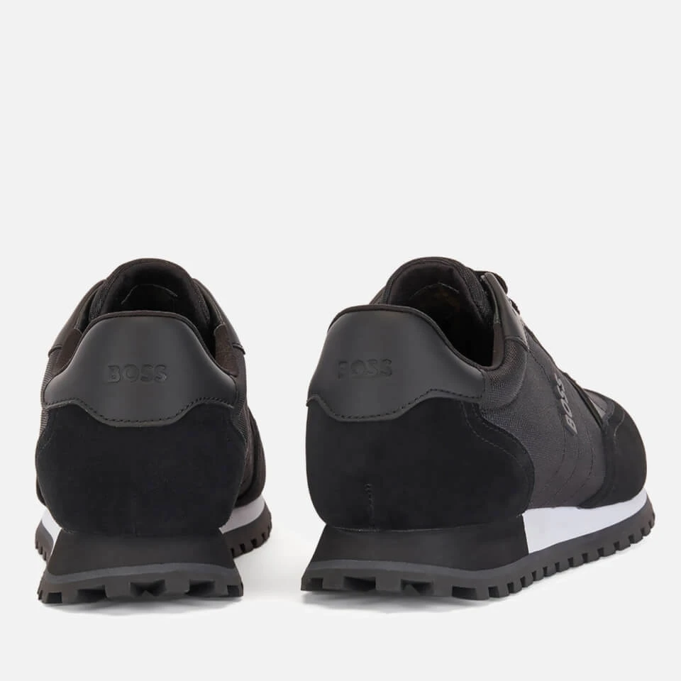 BOSS’ Parkour Runn running-style trainers have mixed media uppers in black nylon and suede. The lace-up style has logo details on the quarter, tongue and heel. Soft linings and cushioned soles for comfort.