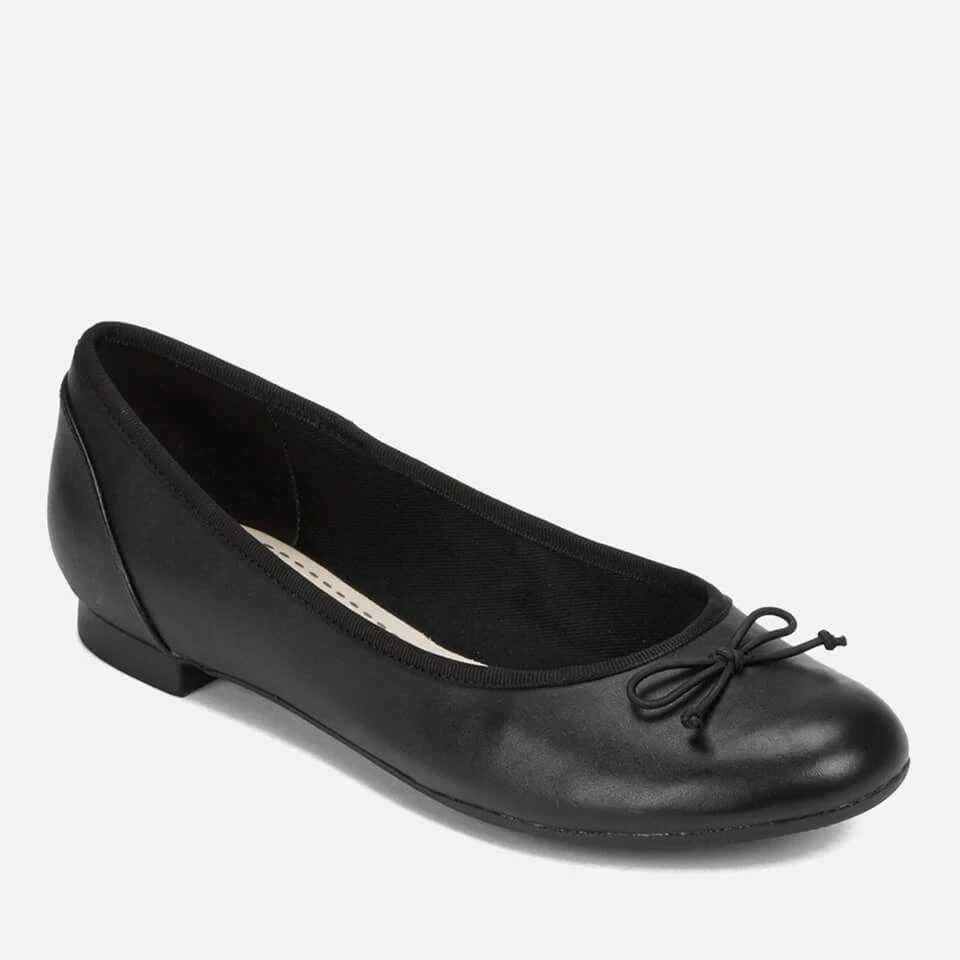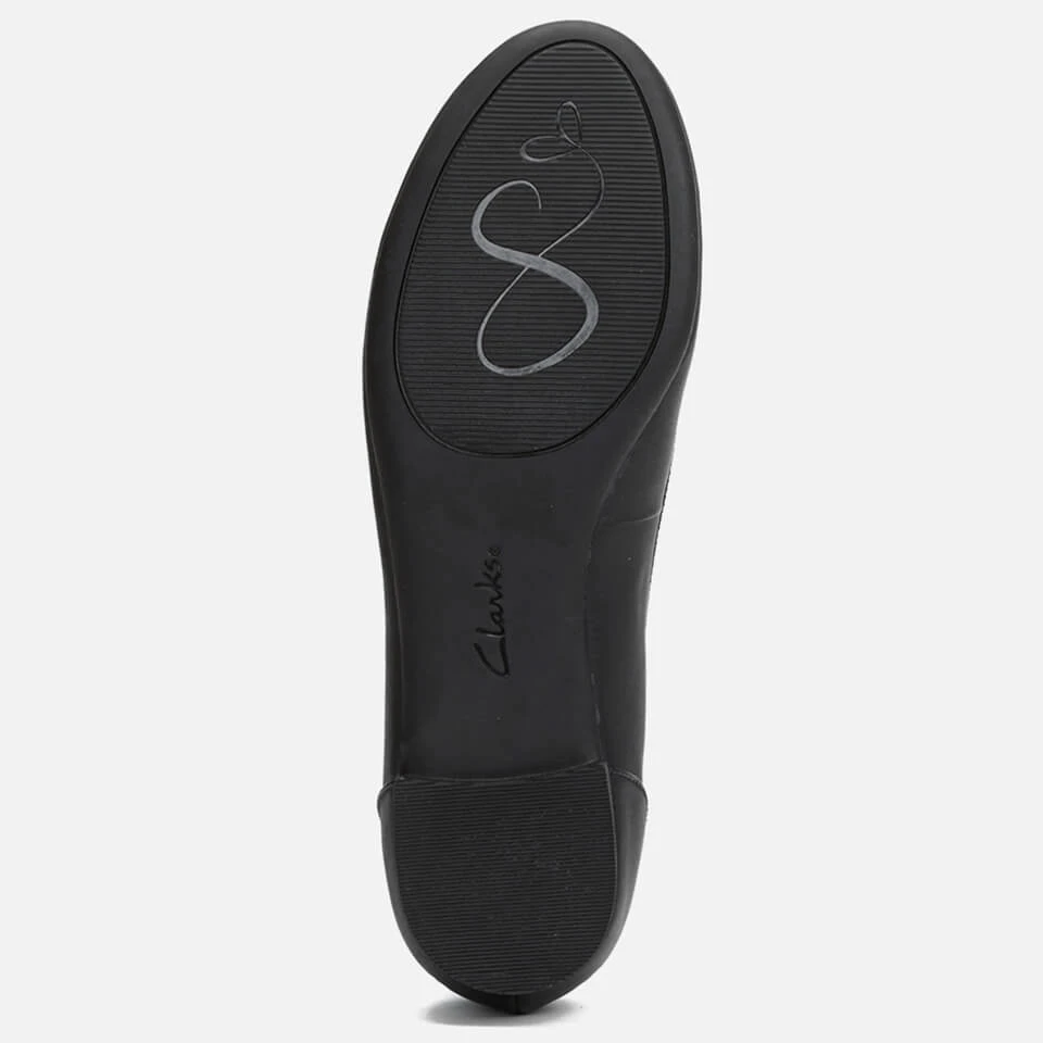 Black ballet flats from Clarks. Crafted from soft leather, the ‘Couture Bloom’ leather flats comprise a slip-on style and a textured rubber sole for maximum traction. The insole uses Clarks’ Cushion Soft™ technology reducing strain on the foot for ultimate comfort. The timeless shoes are finished with bow detail to the front.