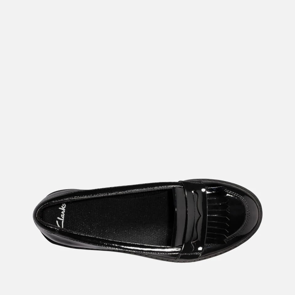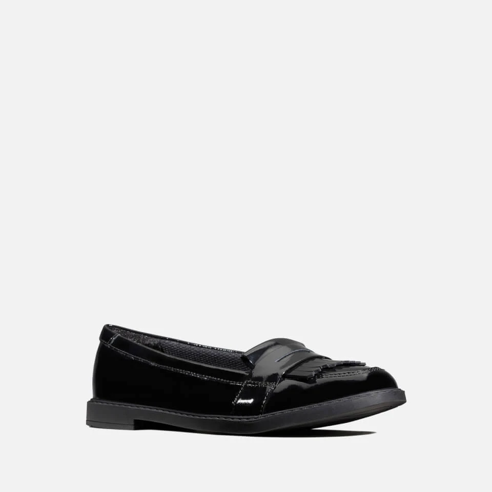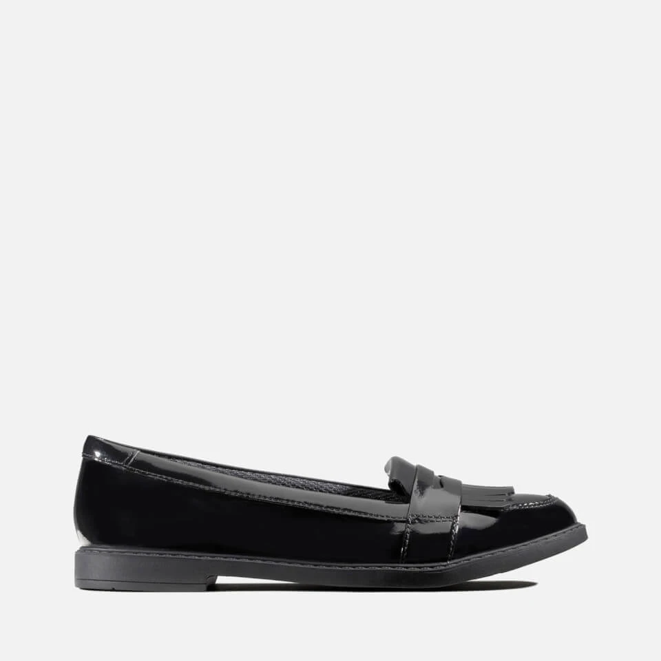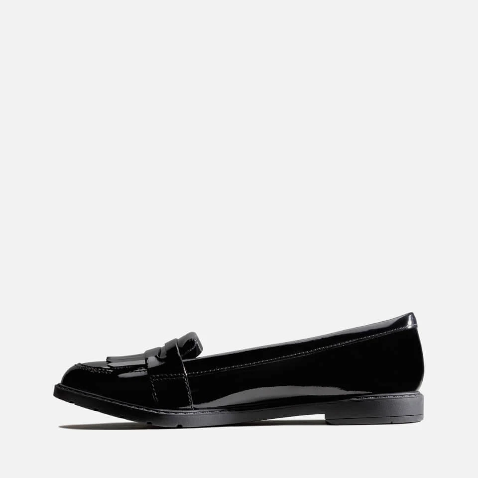 Clarks’ Scala Bright school shoes are a classic slip-on loafer with fringing on the front. They’re made from premium black patent leather and have padded collars for support. Partially lined from recycled materials, they have Agion® technology to keep feet feeling fresh and a lightweight, flexible rubber sole.