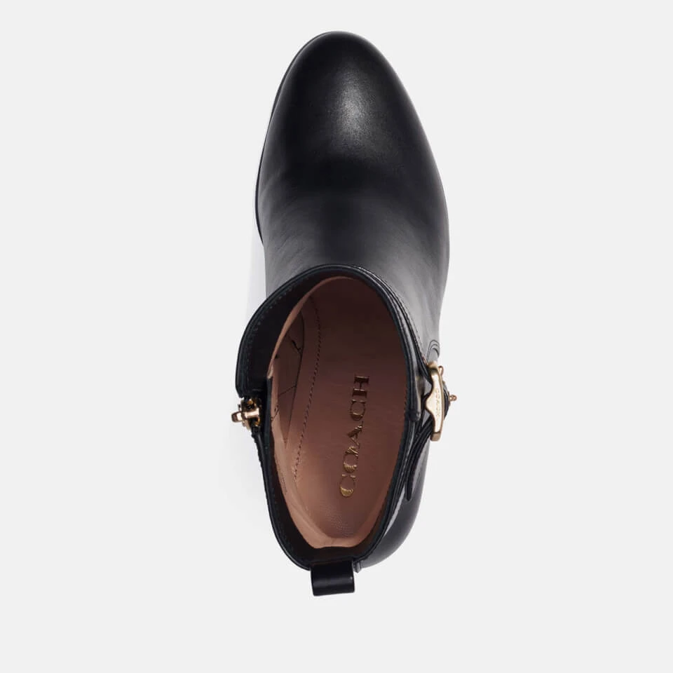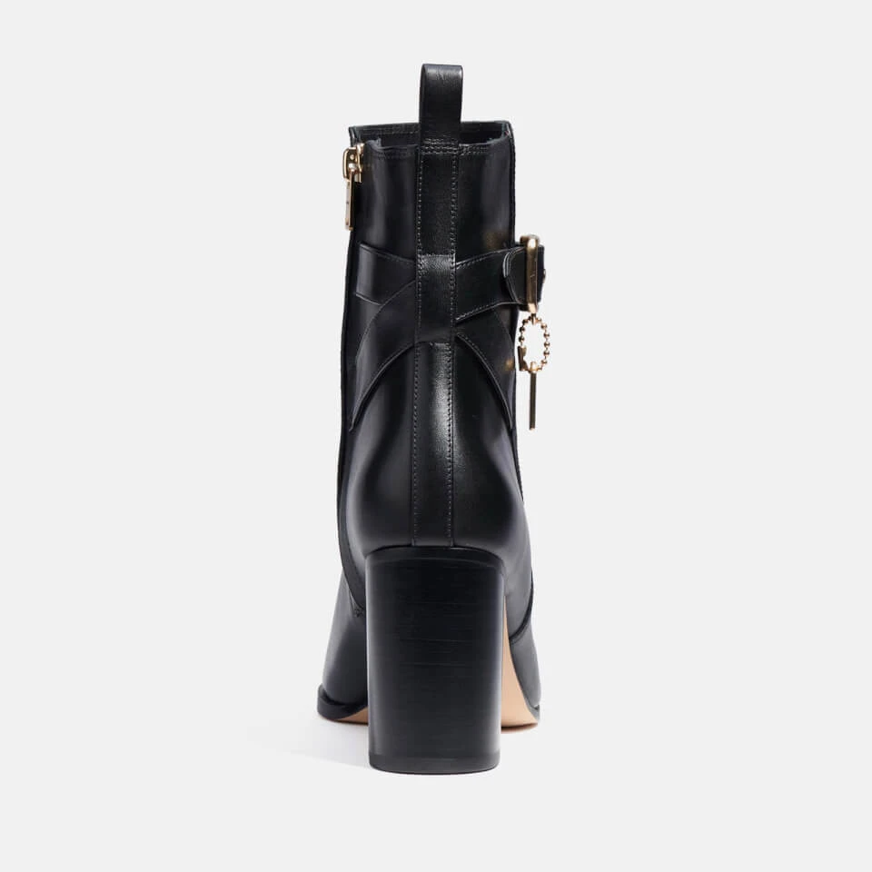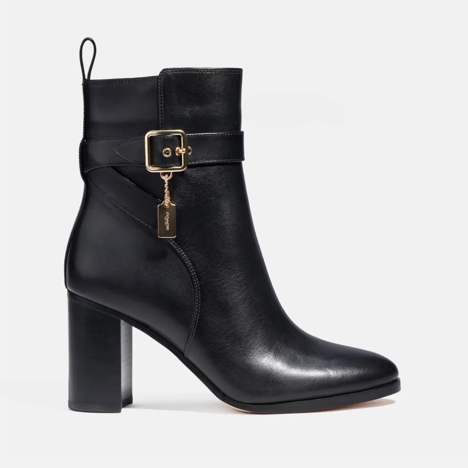 - Pull tab, gold-toned hardware, buckled strap, pointed toe