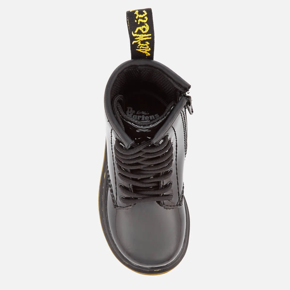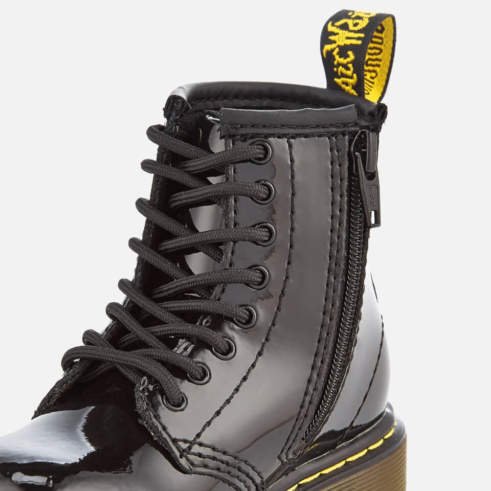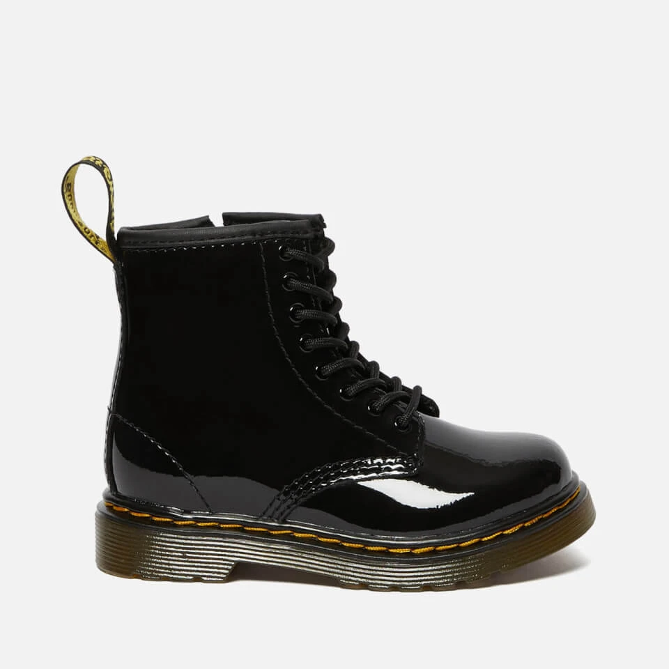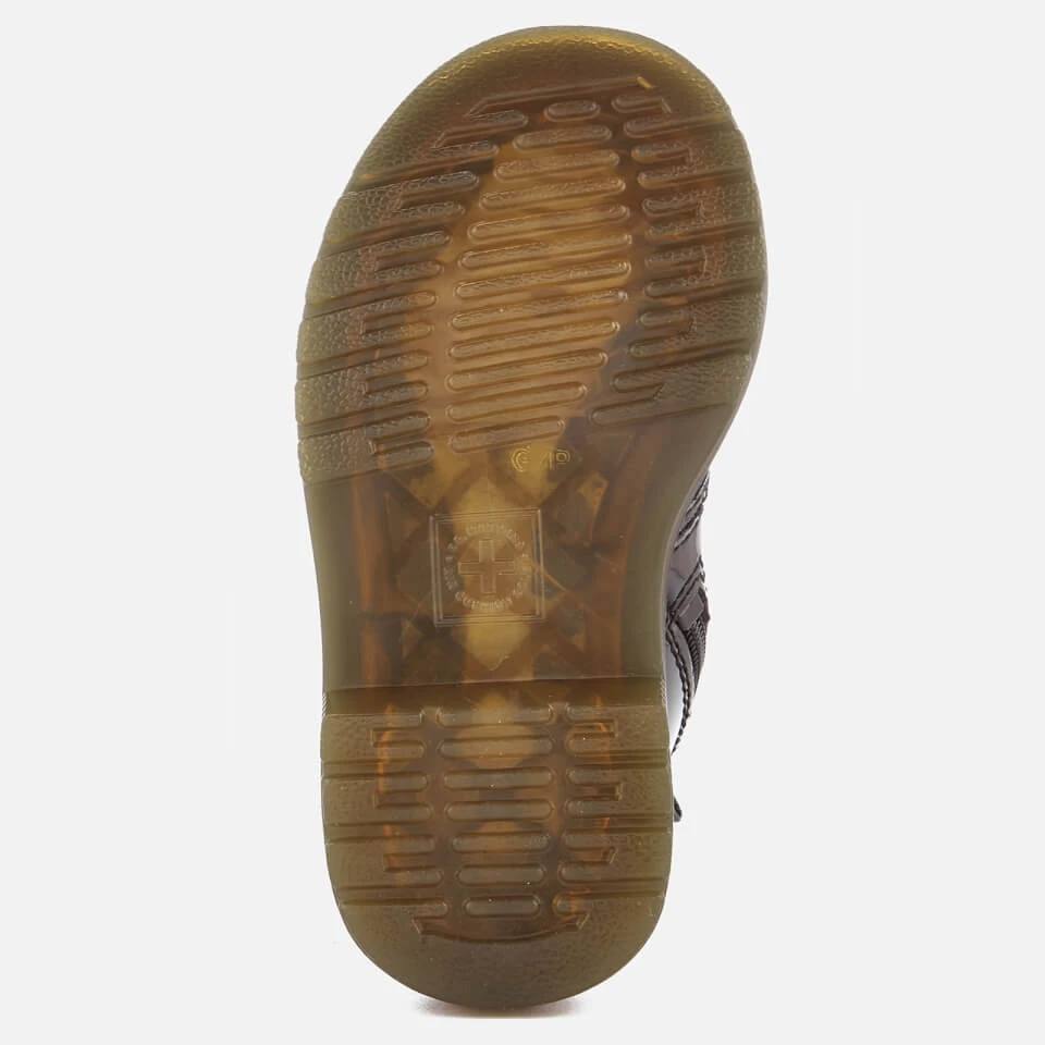Toddlers’ black leather boots based on the iconic 1460 silhouette from Dr. Martens. Crafted from black patent Lamper leather, the 8-eyelet boots feature an inside zip closure to easily get the boots on and off. Set on a durable air cushioned sole that is cemented to the upper, the boots feature the signature sole pattern for added grip and side grooves. Complete with contrast yellow stitching and an ‘Air Wair’ woven brand tab to the heel.