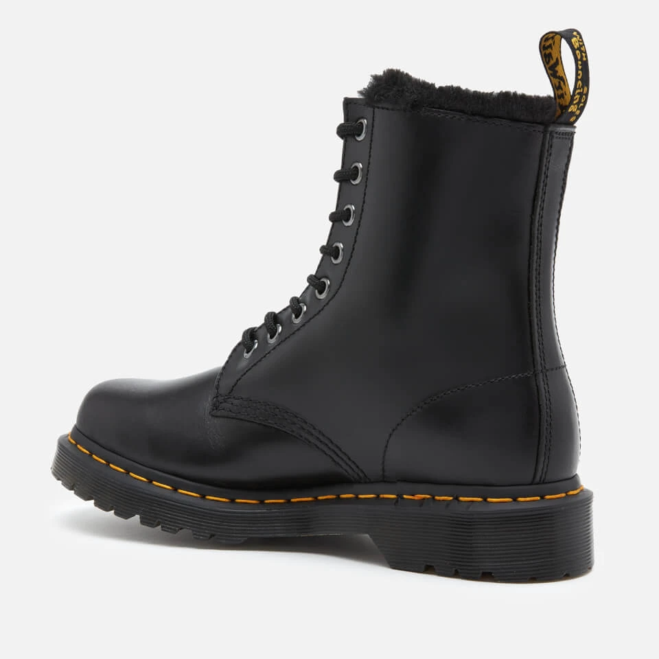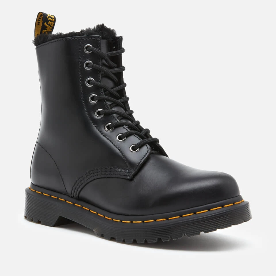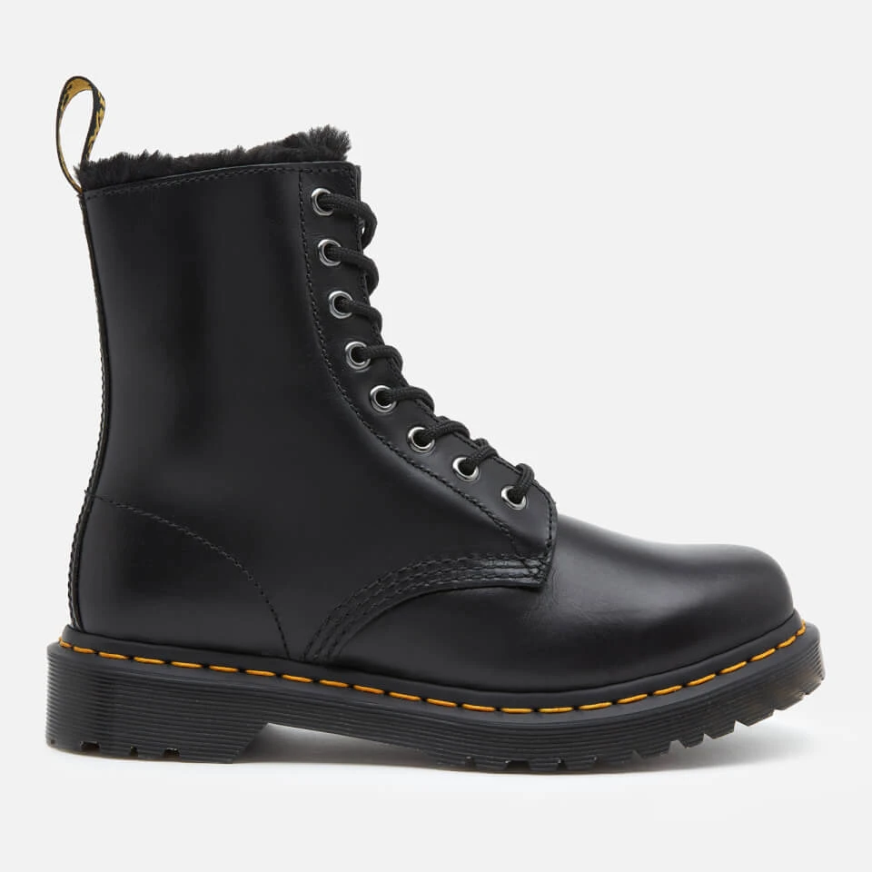 Classic Dr. Martens boots with a winter twist. Lined with fuzzy faux fur, the ‘1460 Serena’ ankle boots are crafted in Burnished Wyoming, a durable leather with a subtle grain and oily surface, treated for an antique finish. Dr. Martens’ DNA features include embroidered heel loop, contrast yellow stitching and durable Goodyear welt. Set upon the brand’s iconic air-cushioned AirWair™ sole and extra-tough PVC commando outsole, the eight-eye black boots offer solid footing and slip resistance.