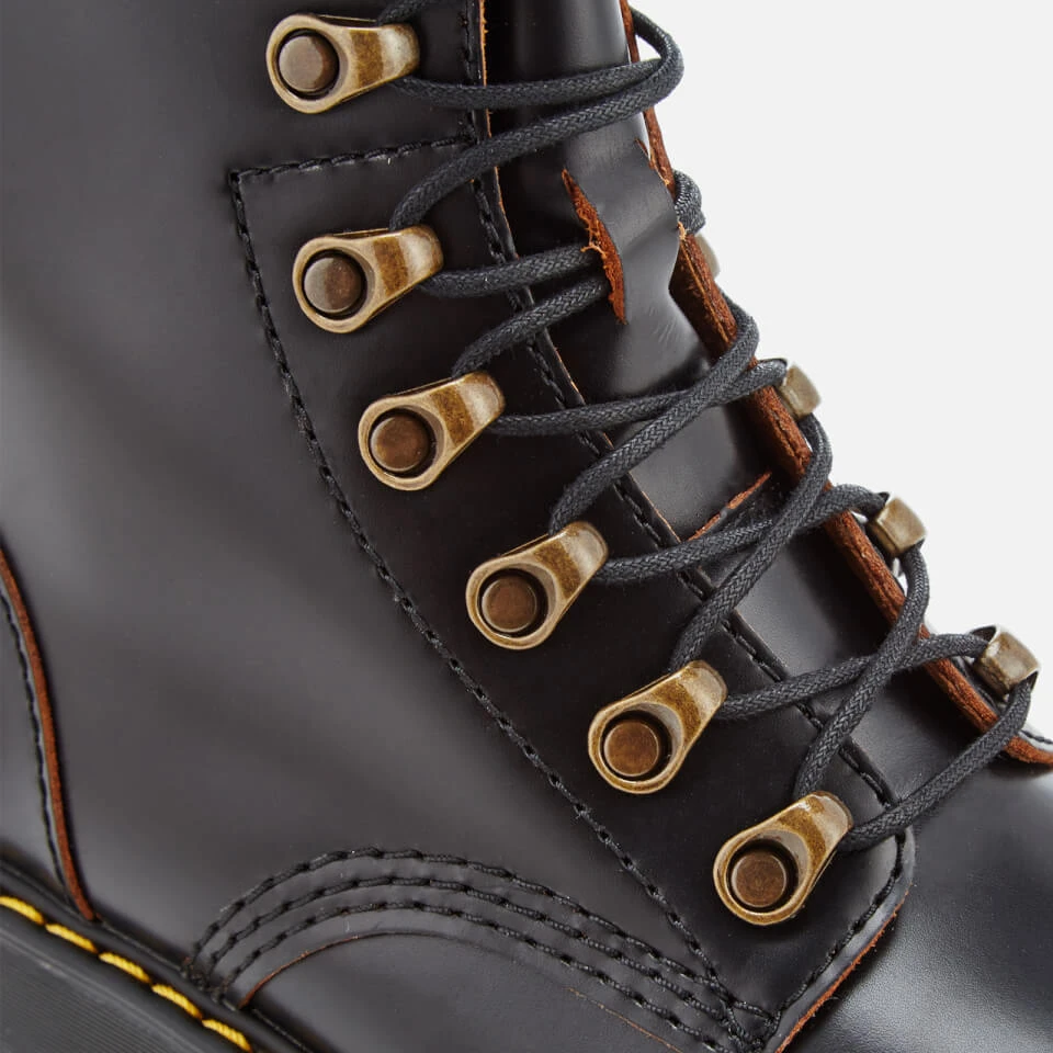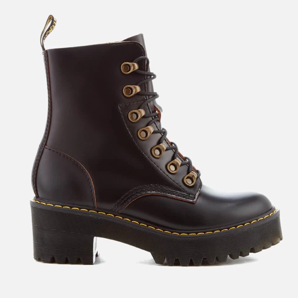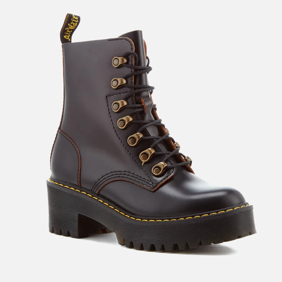 Women’s heeled ankle boots from Dr. Martens. Crafted from the brand’s ‘Vintage Smooth’ leather, a retro version of their signature smooth leather, the ‘Leona’ boots showcase a sleek yet rugged upper with a rounded toe, lace-up fastening with antiqued brass tunnel eyelets, and signature scripted heel pull for entry assistance. Set upon an AirWair™ air-cushioned sole with platform sole, chunky heel and commando tread. The sole has been constructed by stitching it to the base of the upper and insole, and is oil, fat and slip-resistant. Contrast yellow stitching adds a signature finish to the design.