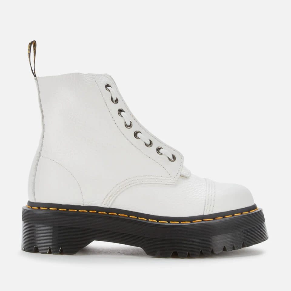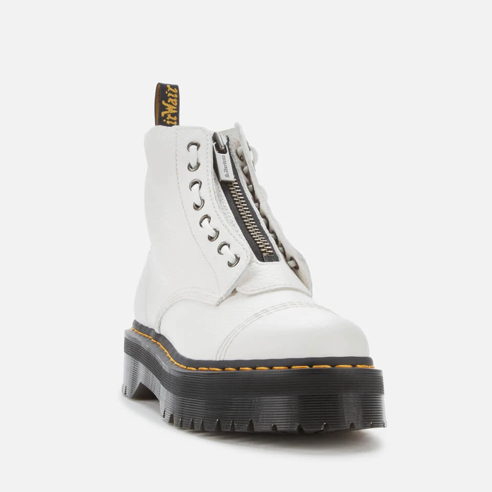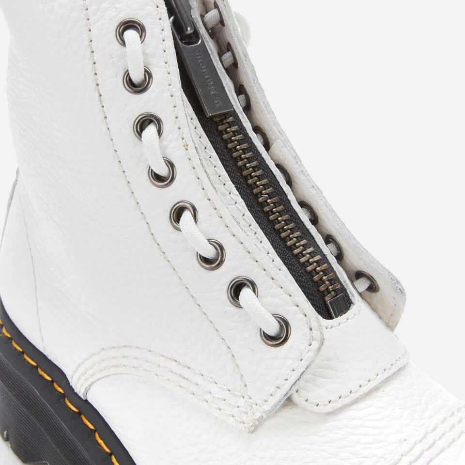 Chunky white leather platform boots by Dr. Martens with a removable jungle piece zip fastening to the front. The ‘Sinclair’ boots have been reworked in eye-catching and hardwearing white pebbled leather, which is soft and supple even on the first wear.