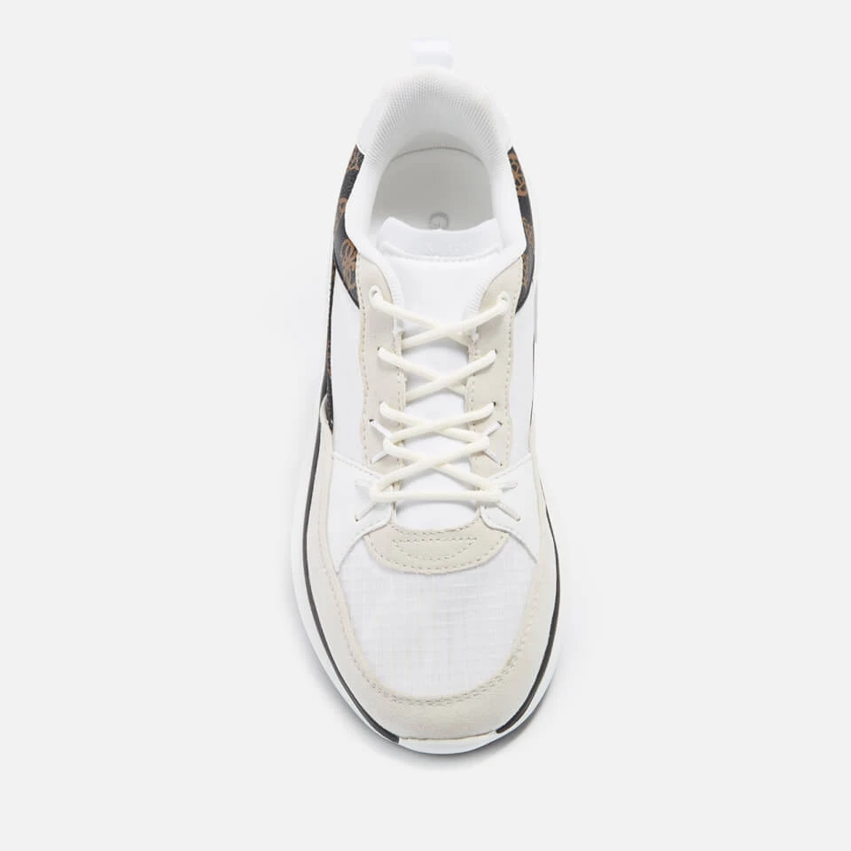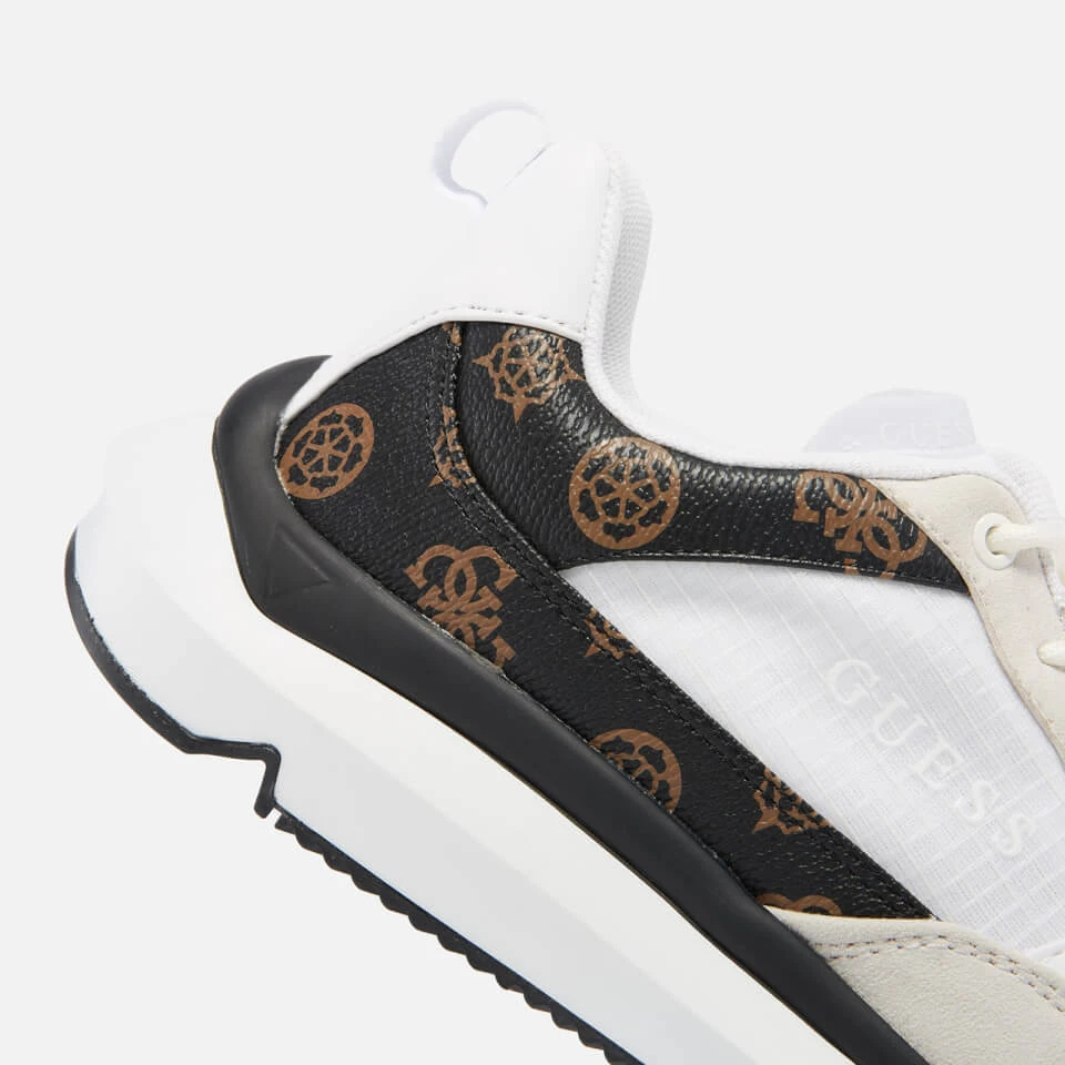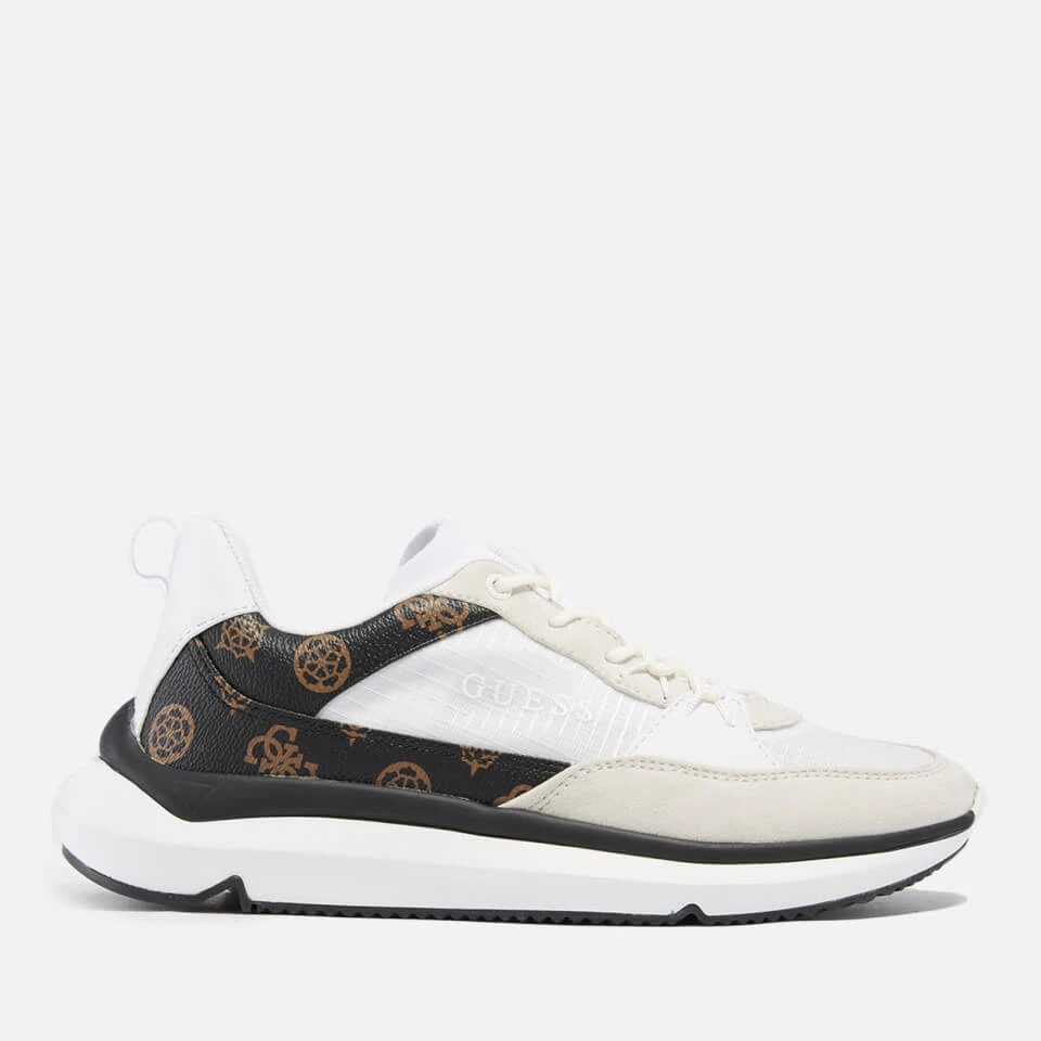 - Printed brand logo, faux leather logo panels, faux suede panels, brand heel tab, embossed soles