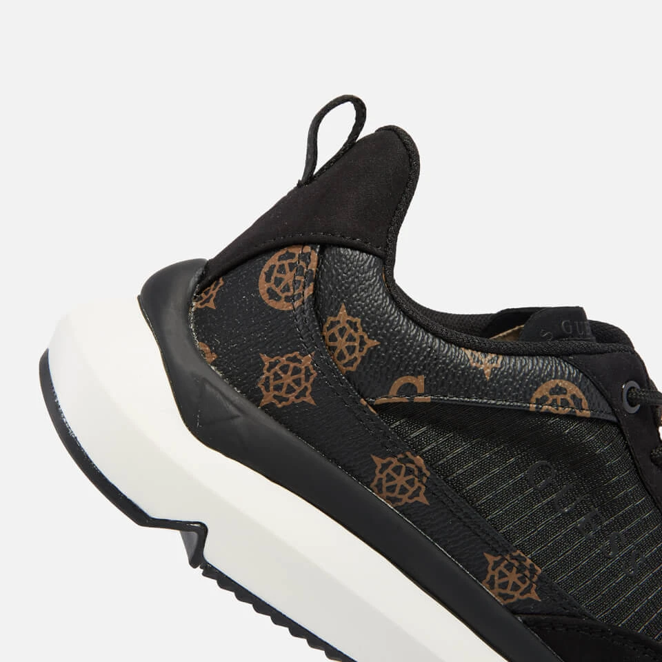 - Printed brand logo, faux leather logo panels, faux suede panels, brand heel tab, embossed soles
