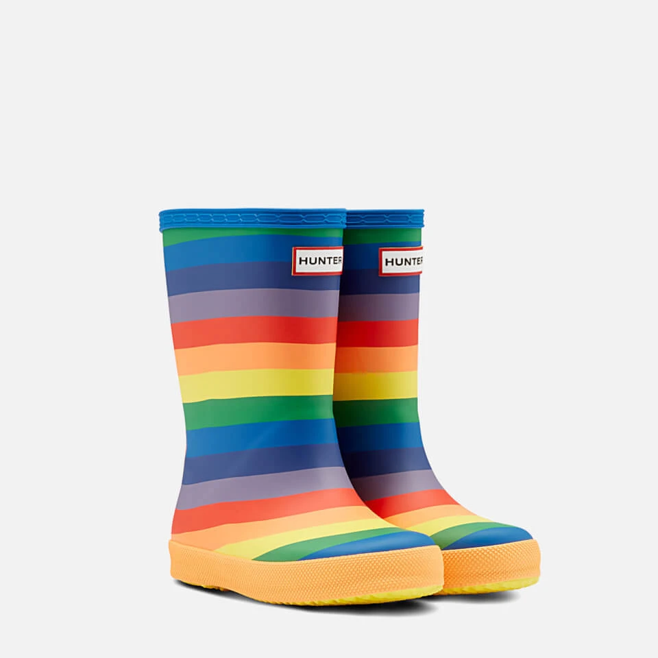 Designed in rainbow stripes, the Hunter kids’ wellies are handcrafted entirely from waterproof rubber. Lined with breathable cotton, the wellington boots are built upon natural vulcanised soles with Original Kids tread pattern. Finished with a rubberised logo patch appliquéd on the top-front shaft.