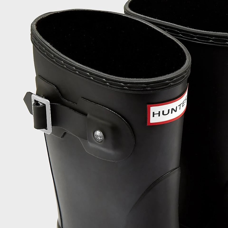 Women’s short Hunter wellies. Handcrafted from 28 parts of waterproof, vulcanised rubber on the original last, the ‘Original Short’ boots offer a comfortable fit with cushioned sponge insoles. The wellington boots are reinforced with a traditional calendered sole and adjustable buckle strap to the shaft. Moulded lines, matte finish and Hunter logo finish the design with signature qualities.