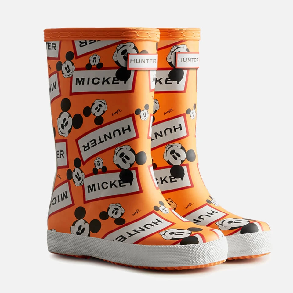 These Hunter X Disney orange first wellington boots for little ones combines renowned expertise in wet weather attire with playful Mickey Mouse motifs. Made from waterproof, natural rubber, they feature a flatter sole and rounder toe in addition to enhanced traction on the sole. Soft cotton lining ensures comfortable wear.