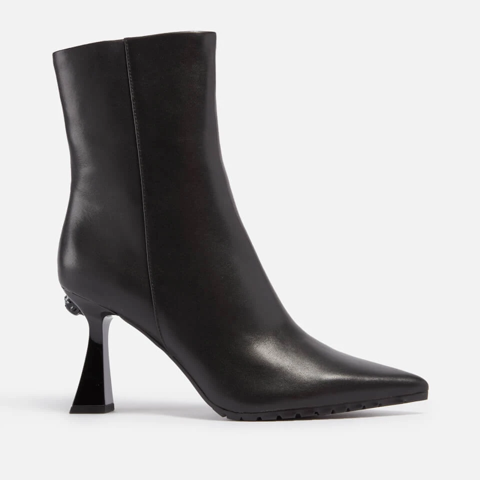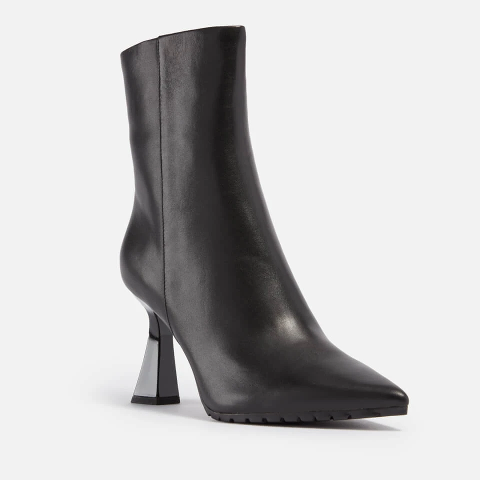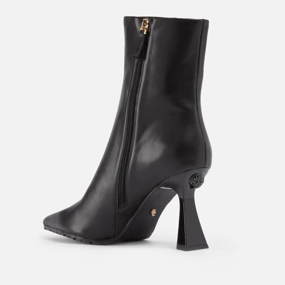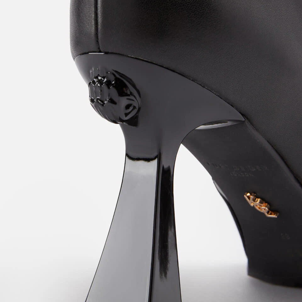 - Pointed toes, eagle and monogram plaques, flared heels, rubber soles