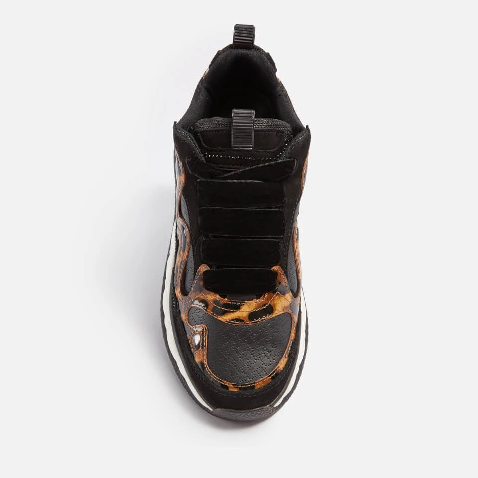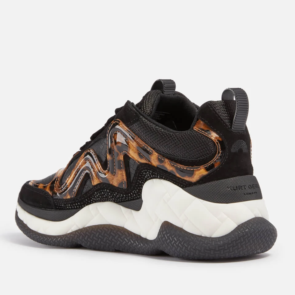 - Pull tabs, designer logos, patent leopard print and embellished panels, chunky soles