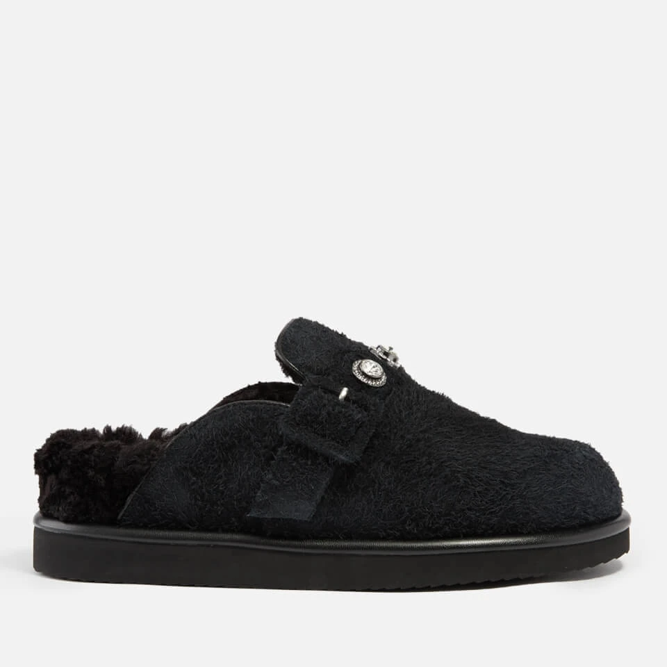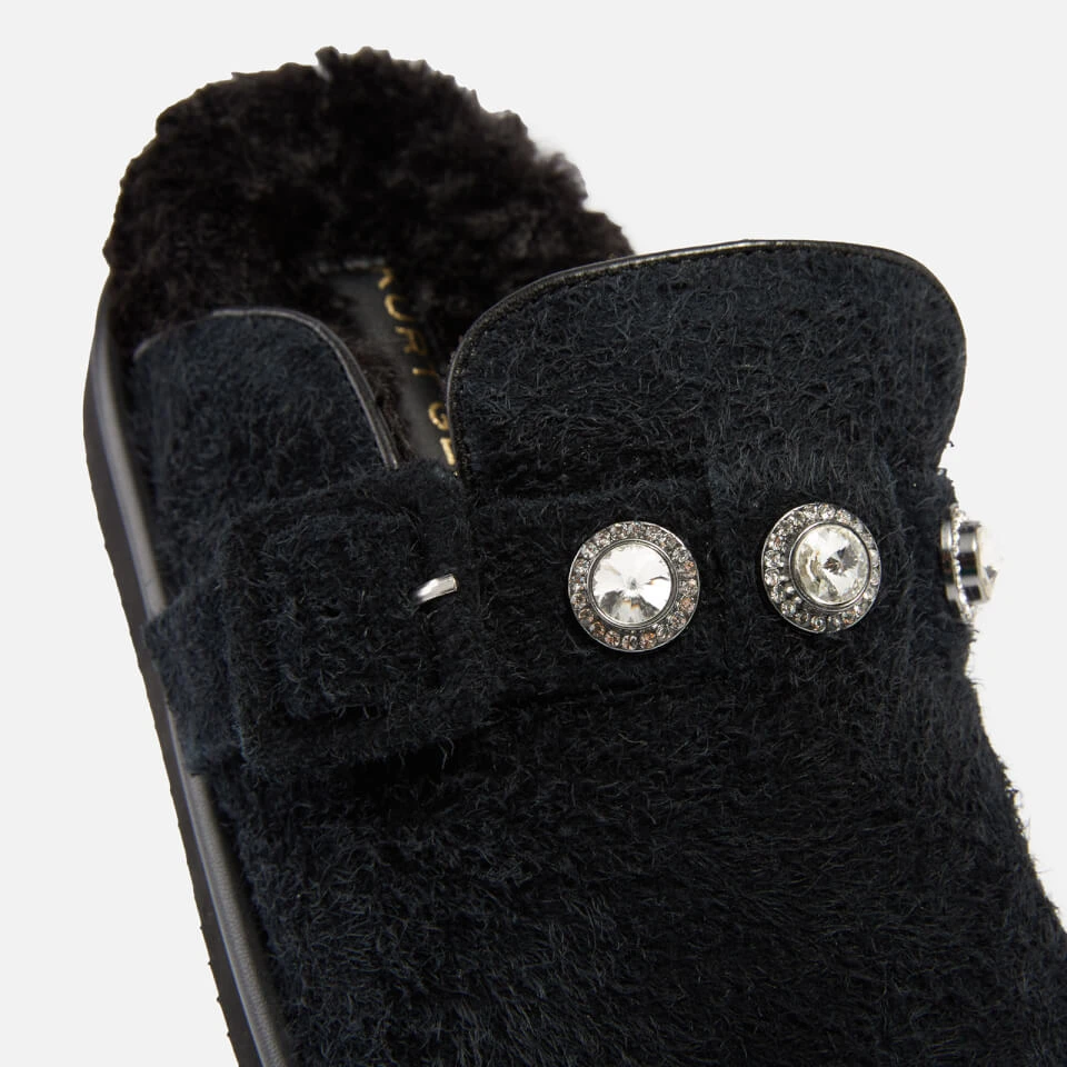 - Crystal embellishments, buckled straps, faux shearling linings, rubber soles