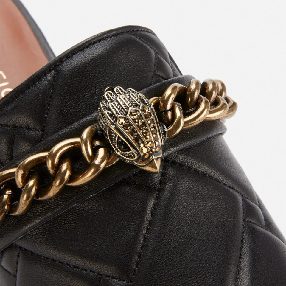 Slip-on Chelsea flat mules by Kurt Geiger London. This style is crafted from quilted black leather and features the brand’s signature eagle head emblem in a gold-tone metal, which adds a touch of striking embellishment.