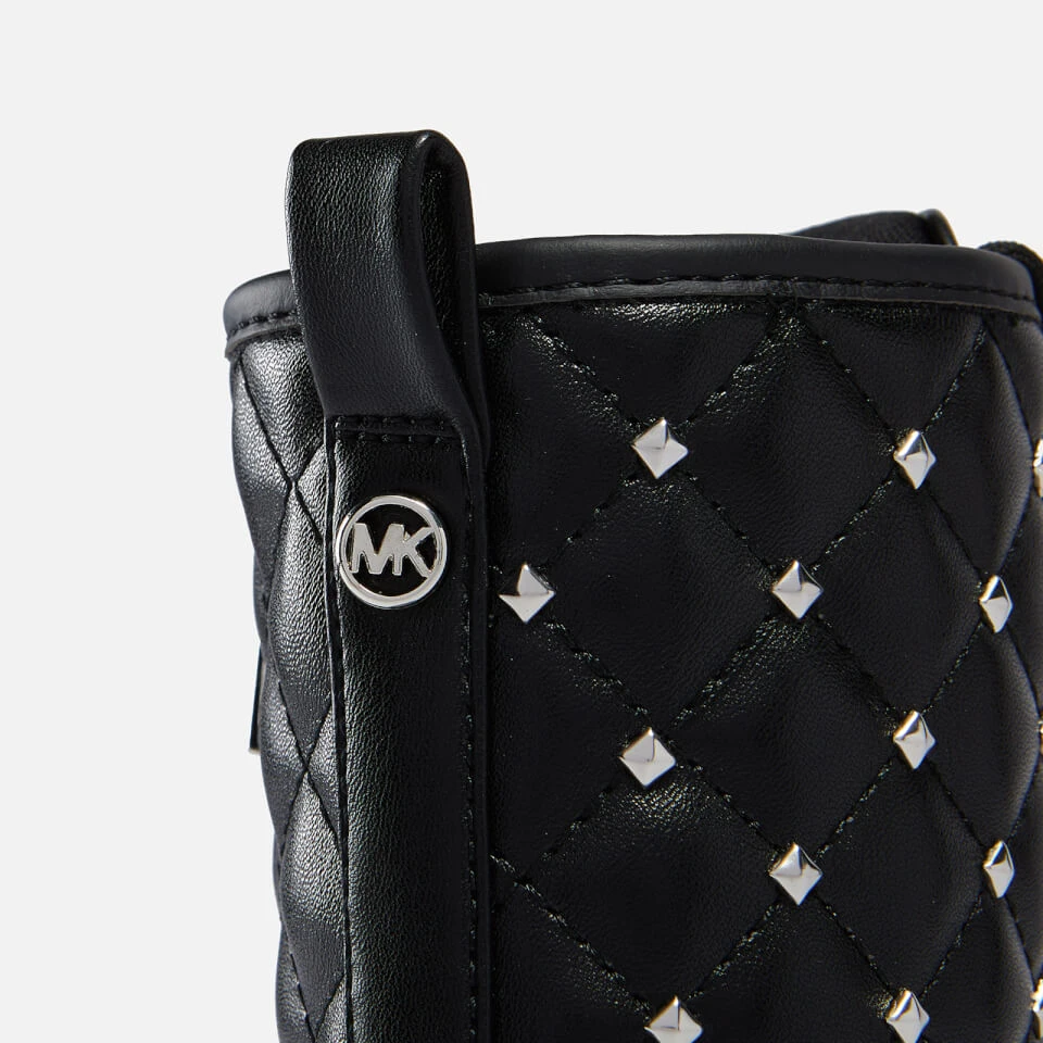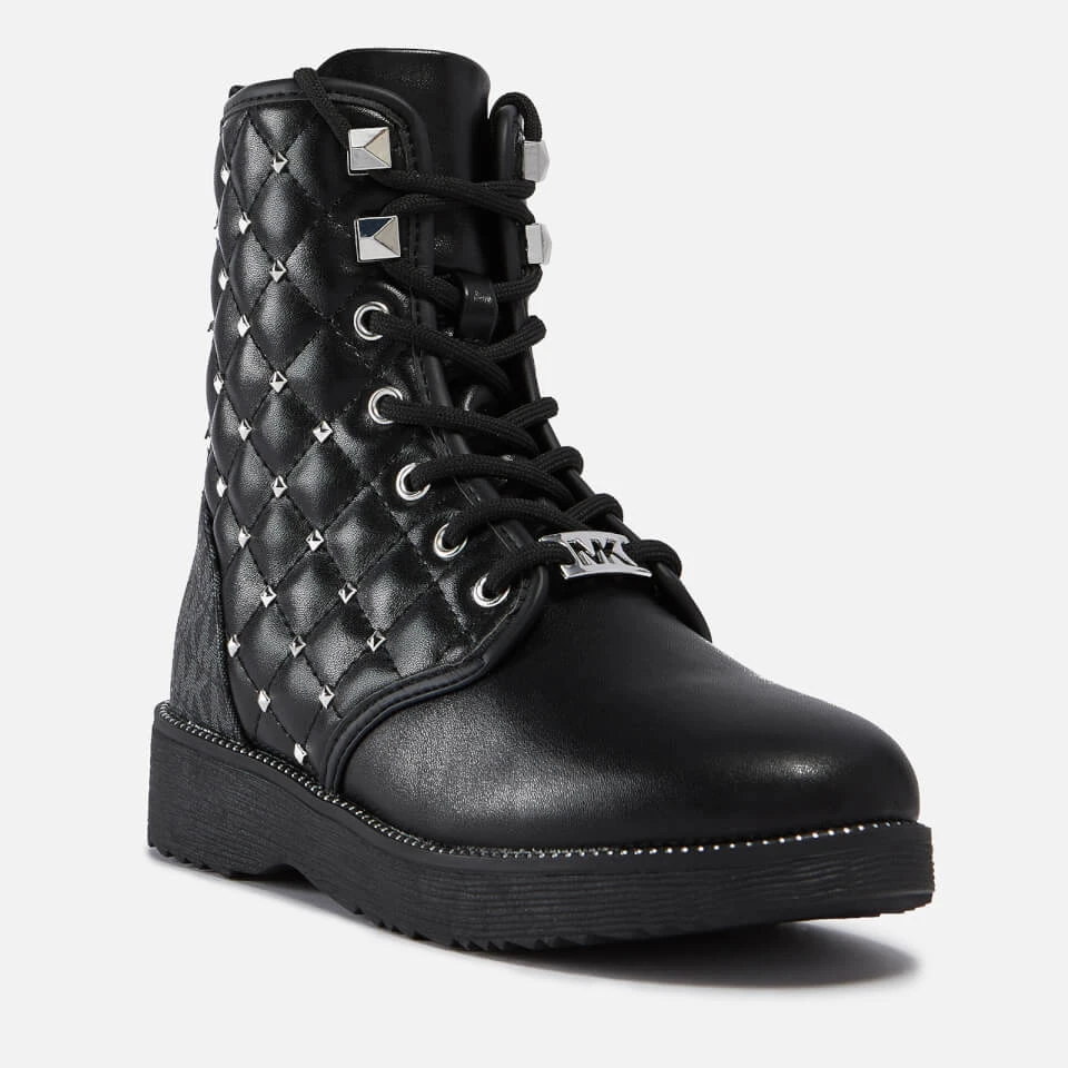 - Heel pull tabs, heel brand tag, silver-tone studs, quilted upper, stud lace hooks, moniker-printed heel, brand lace tag