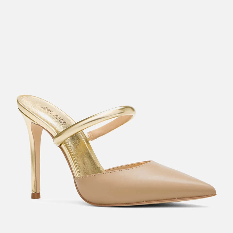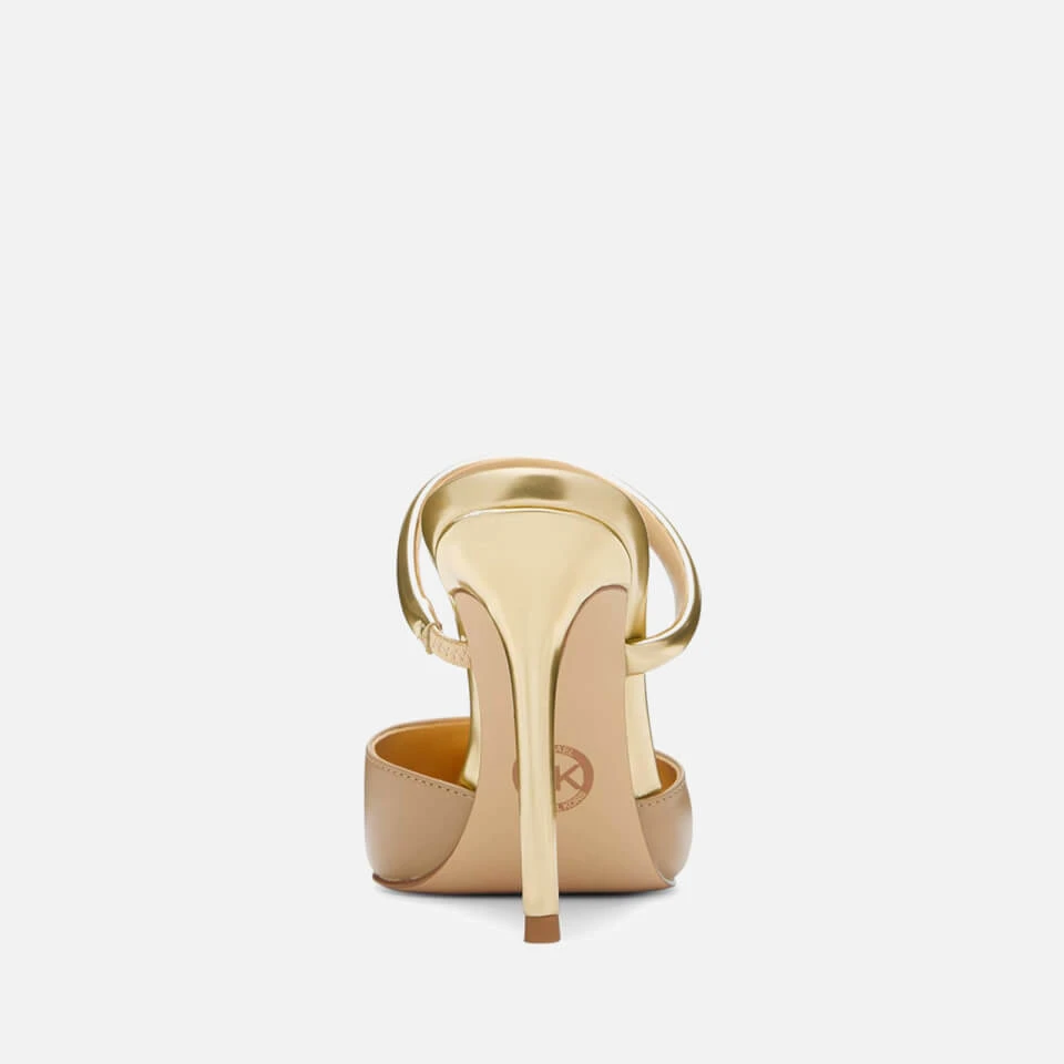 - Pointed toe, stiletto heels, gold-toned strap, rubber soles