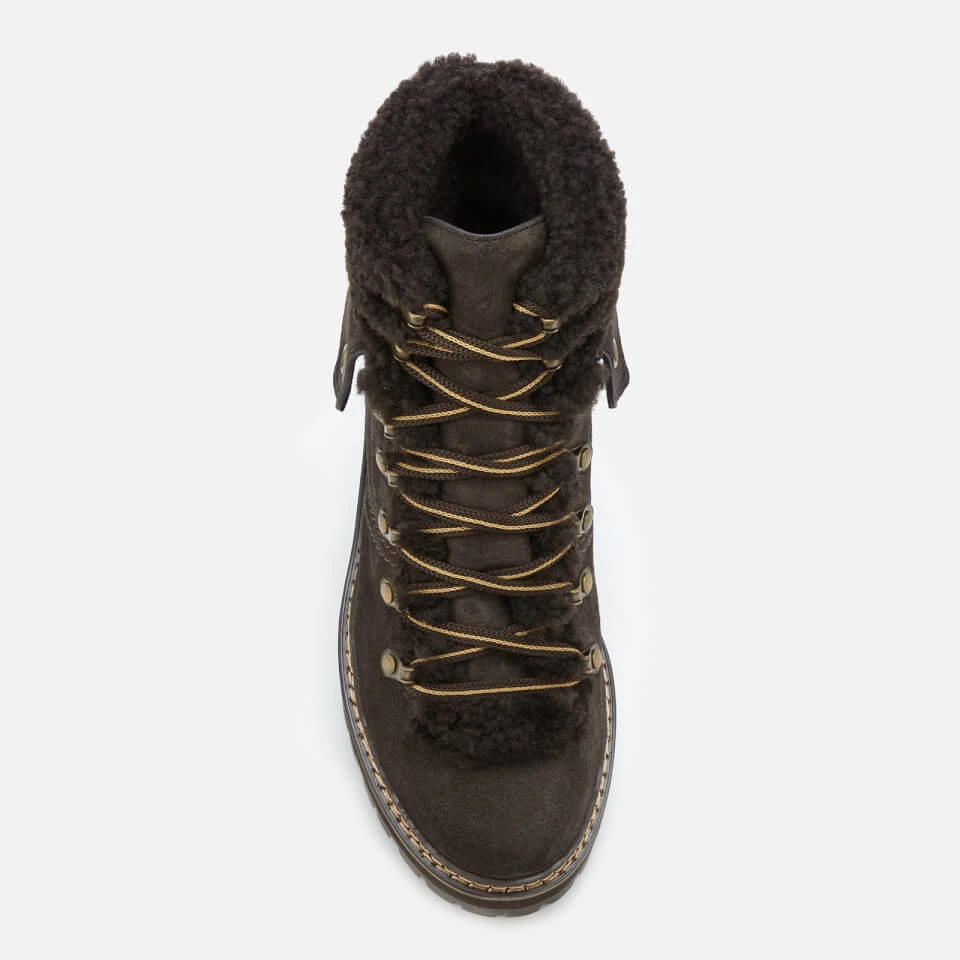 Suede hiking style boots from See By Chloé. Crafted from supple suede, the women’s round toe ankle boots are designed with a shearling cuff and lace trim, a fold down ankle flap with debossed See By Chloé branding and antiqued gold-tone metal eyelets. The lace fastened boots sit on a stacked sole with contrasting welt stitching and a chunky lug outsole for added grip. Complete with a branded dust bag.