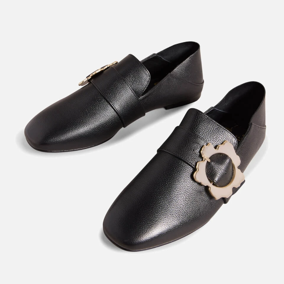 - Collapsible heel, penny bar, oversized gold-tone floral buckle, black resin soles