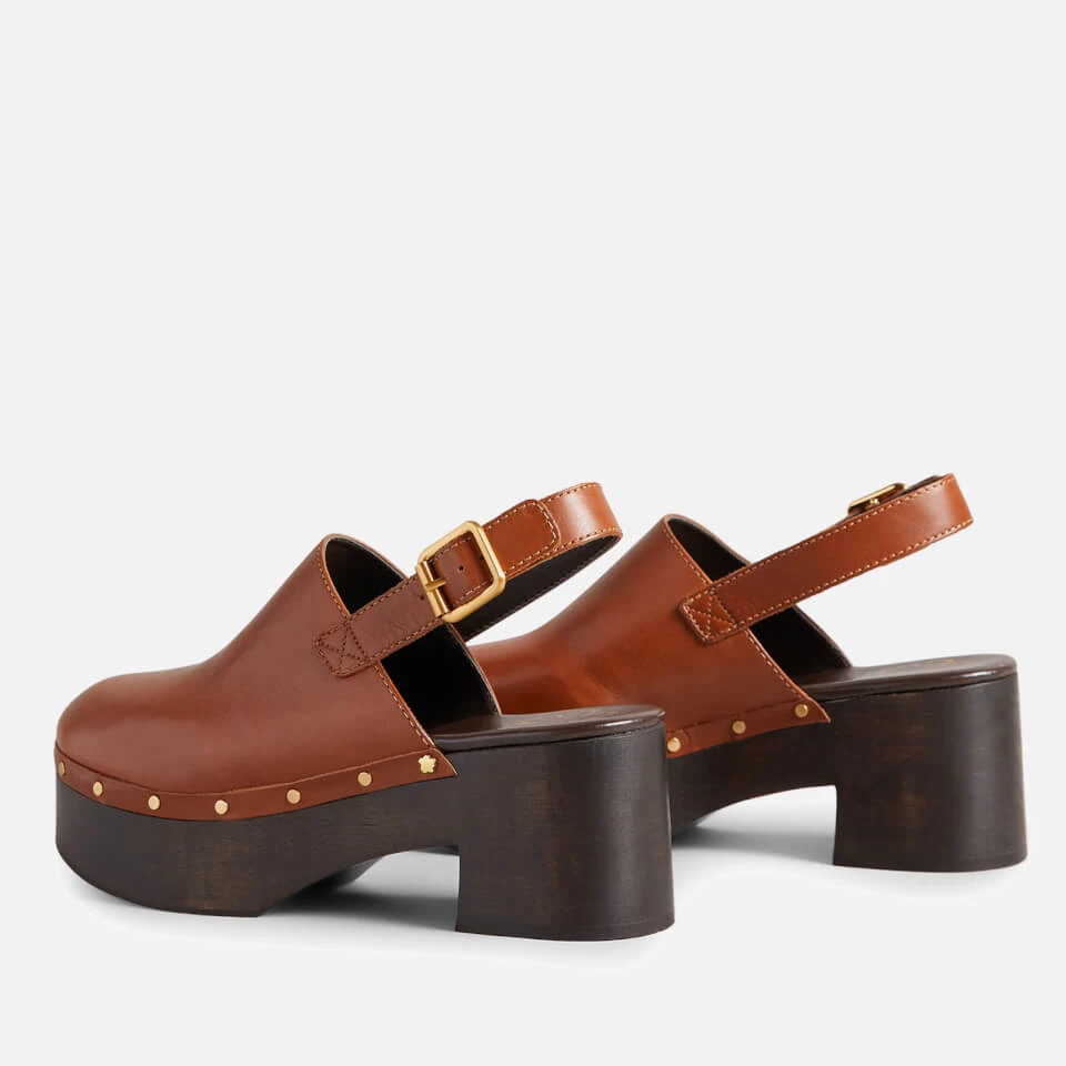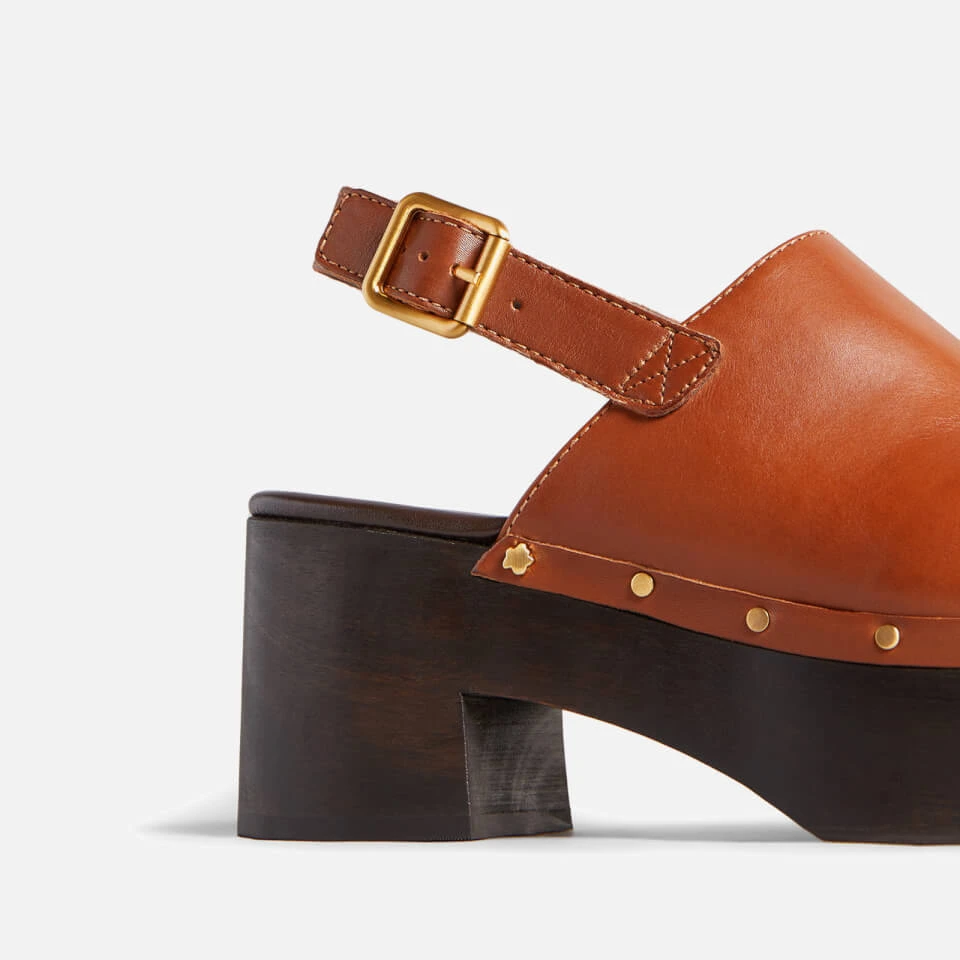 - Slingback heel, gold-tone stud trims, platform faux wood soles
