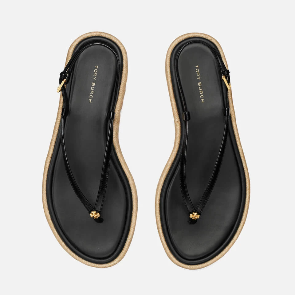Tory Burch’s sandals are perfect for slipping on with flowy dresses or linen trousers. They have slender leather straps dotted with the brand’s gold-tone plaque at the toe posts and set on jute soles.