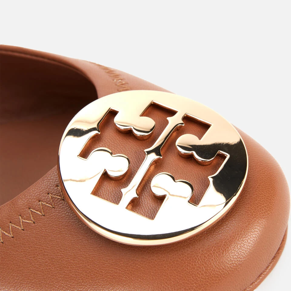 Tory Burch Minnie ballet flats in super-soft nappa leather with gold-tone metal ‘Double T’ hardware on the toe. Designed to be folded and carried in a handbag, the slip-on shoes have a slip-resistant rubber sole and a foam cushioned footbed for long-lasting comfort. Stitch-and-turn sewed stitching on the edges.