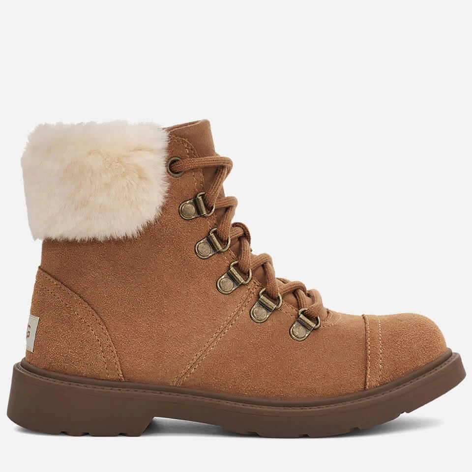 Keep kids’ feet warm and dry in wet weather with the UGG Azell boots. Made with seam-sealed, waterproof suede uppers, they have antimicrobial linings to keep feet feeling fresh, cushioned insoles and side zips to easily slip them on and off. Hiking-style D-ring eyelets and a faux fur collar complete the winter-ready design.