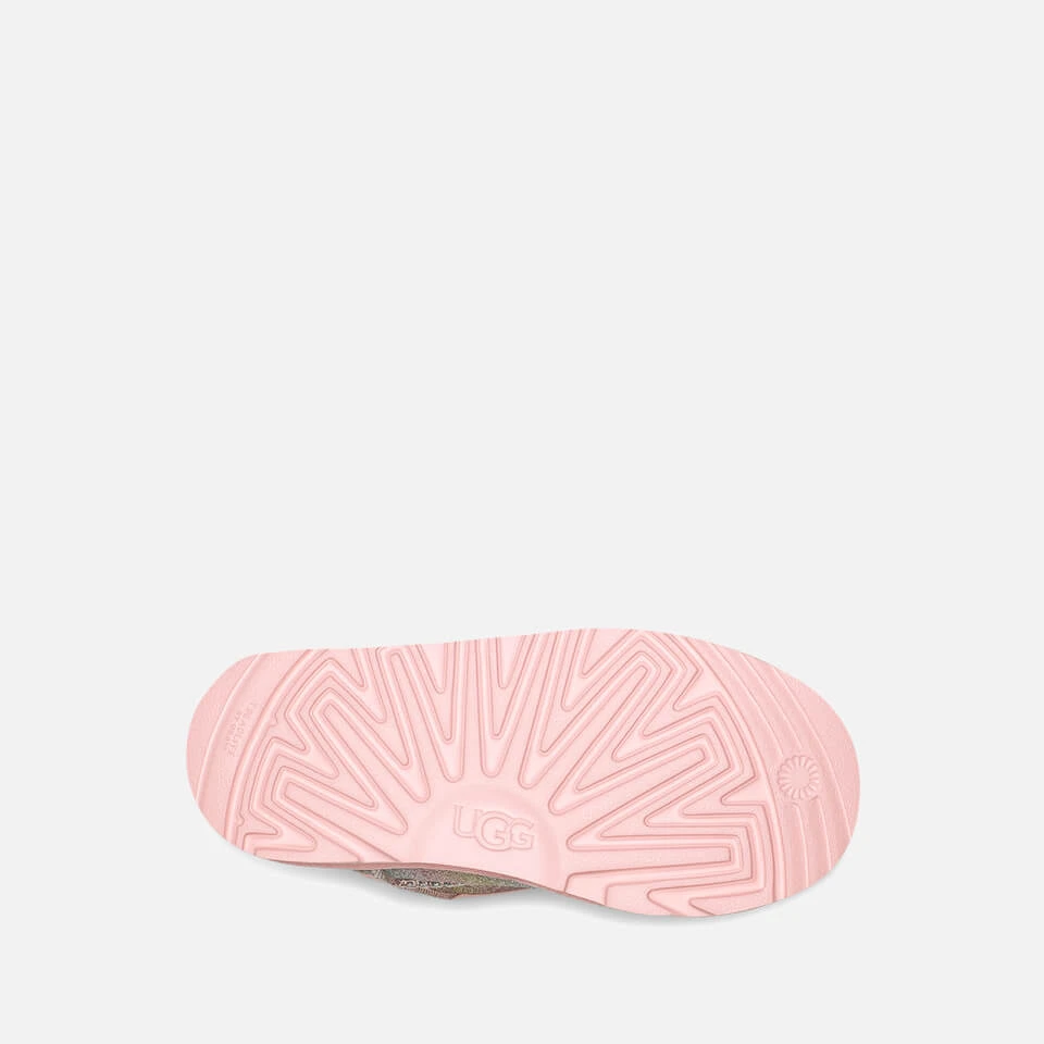 - Brand patches, pale pink details, chunky rubber soles, cream faux shearling lining