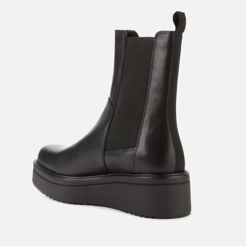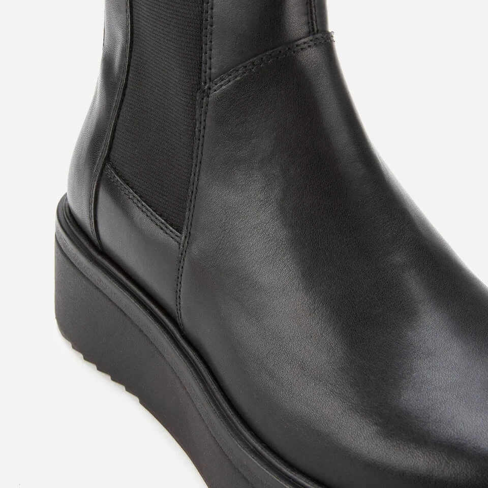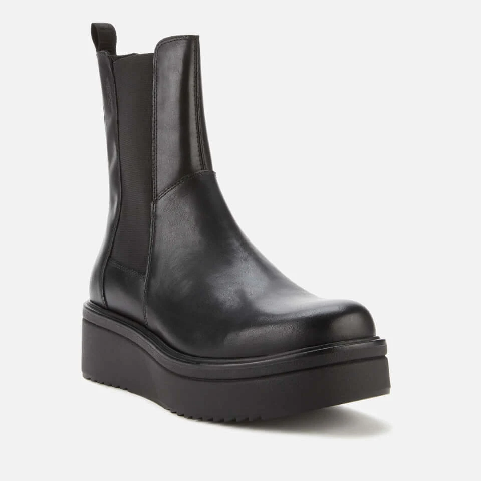 A modern take on the classic Chelsea boot, Vagabond’s ‘Tara’ boots are crafted from smooth black leather and sit on a chunky, yet lightweight flatform sole for a bold, ‘90s-inspired silhouette. The slip-on ankle boots have tonal elasticated side gores and pull tabs at the back to easily pull them on and off. Lined with organic cotton, the chunky Chelsea boots are finished with a debossed logo on the heel.