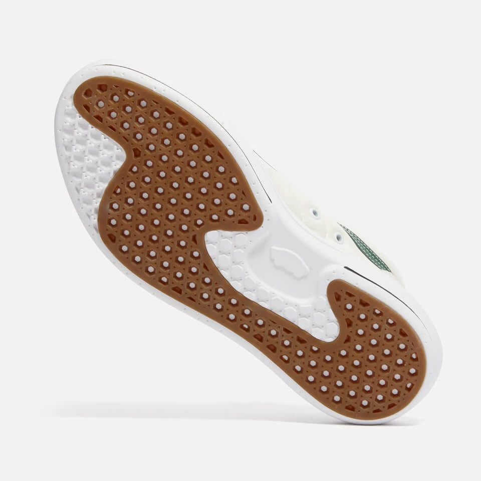 - Leather designer motif, metal eyelets, mesh linings, rubber soles