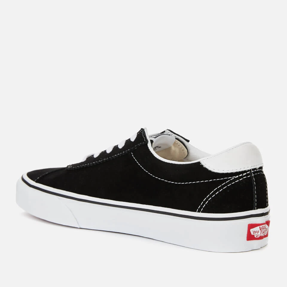 Black Vans Sport trainers with a retro design. Smooth suede uppers with old school V side stripes. Lace fastening. White leather detail on the heel. Signature rubber waffle outsole. Logo tab on the tongue. Vans ‘Off the Wall’ detail on the heel.