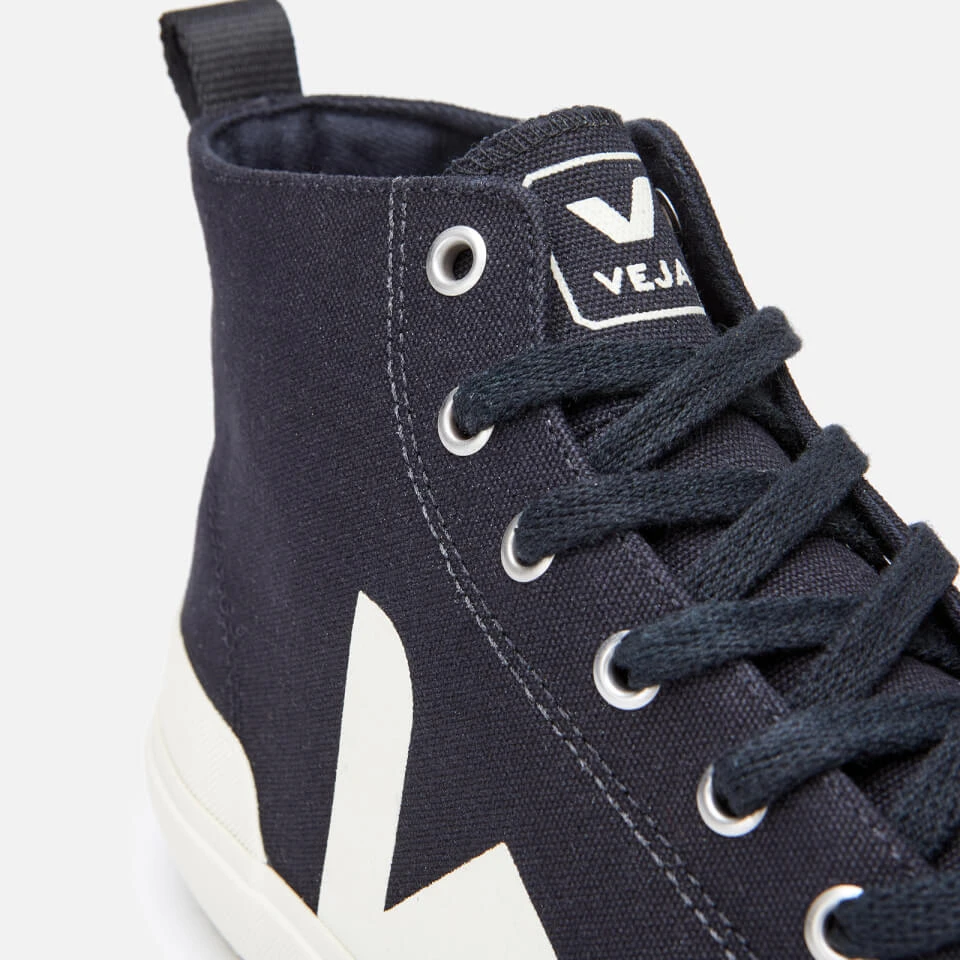 Brazilian-made ‘Nova’ trainers with Veja’s iconic ‘V’ detail in silkscreened print at sides. Designed in and lined with organic cotton canvas, the hi-top sneakers feature rubber toe caps, eight-eye lacing system and soles made of natural rubber from the Amazonian forest. Serrated treads offer great grip.