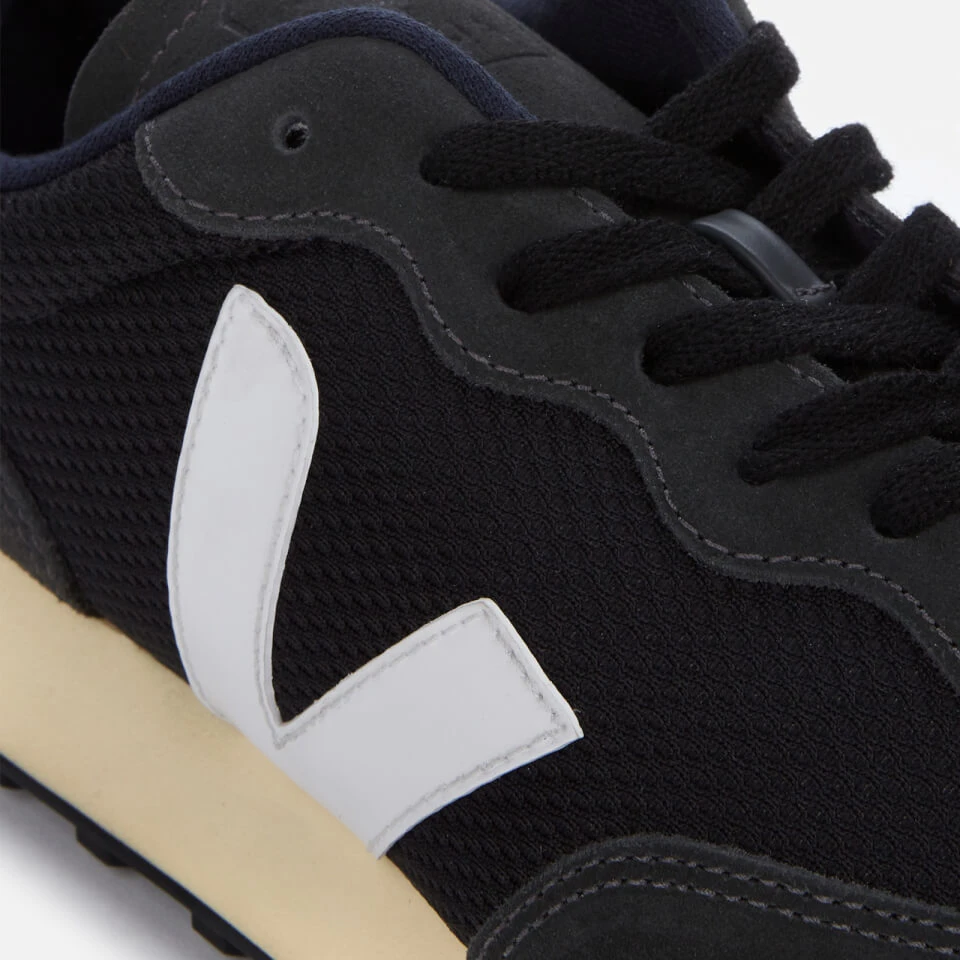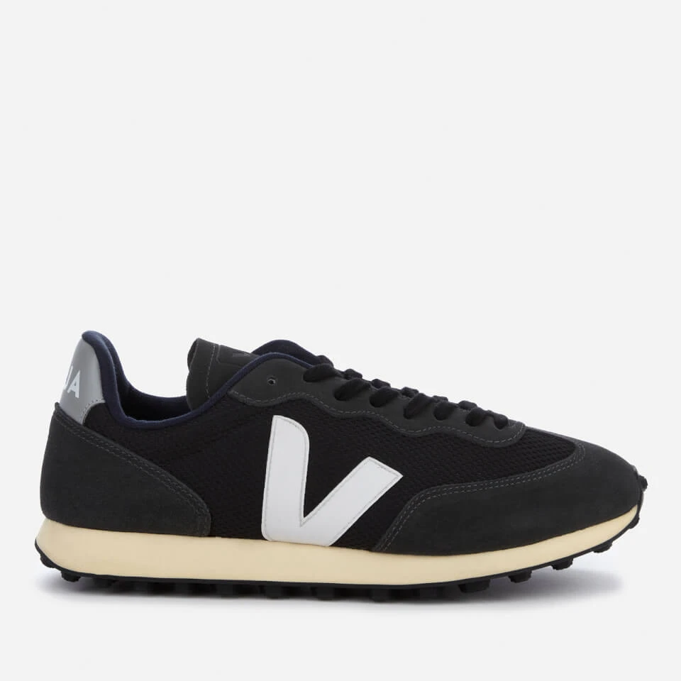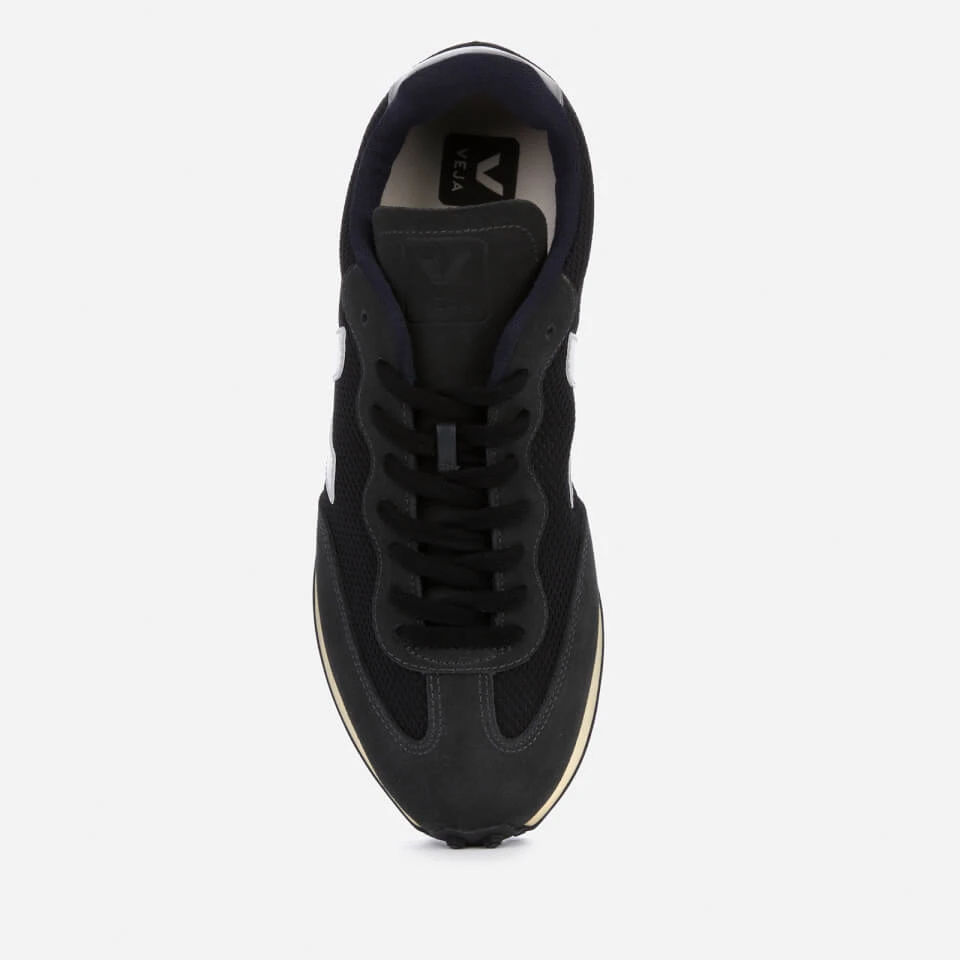 Veja low top trainers with a classic running silhouette. The ‘Rio Branco’ sneakers have water-repellent grey suede and navy mesh uppers. Signature Veja details include ‘V’ logos on the sides in white rubber and a contrasting white leather heel insert with a logo print.