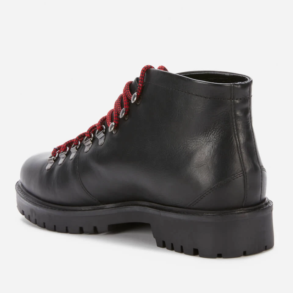 Part of Walk London’s Sean hiking collection, these hiking-style boots have smooth black cow leather uppers and a round toe design. The rugged design has contrasting black and red hiking laces, a bellows tongue and metal D-ring eyelets and a speed hook lacing system. A durable rubber sole with a lug textured outsole completes the design.